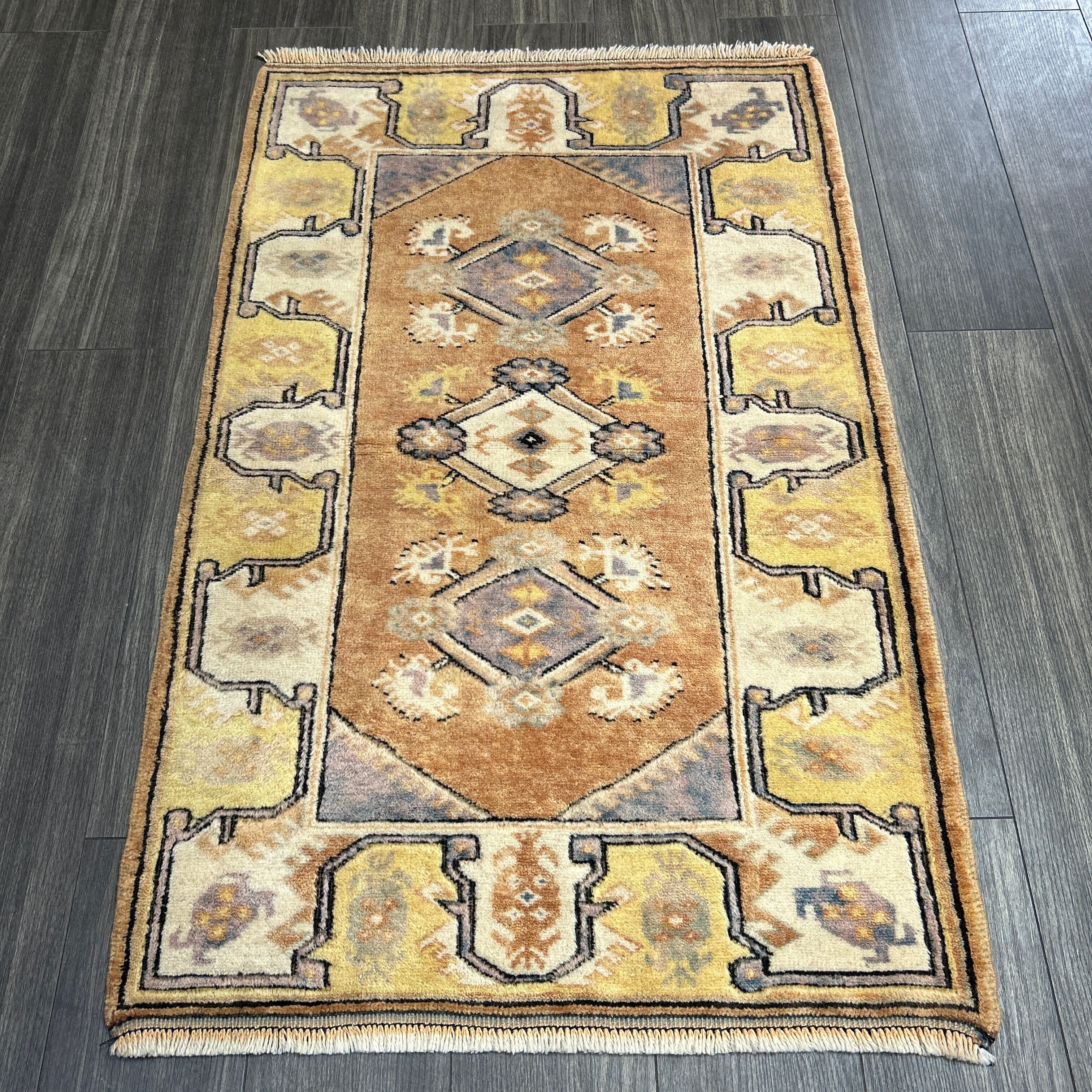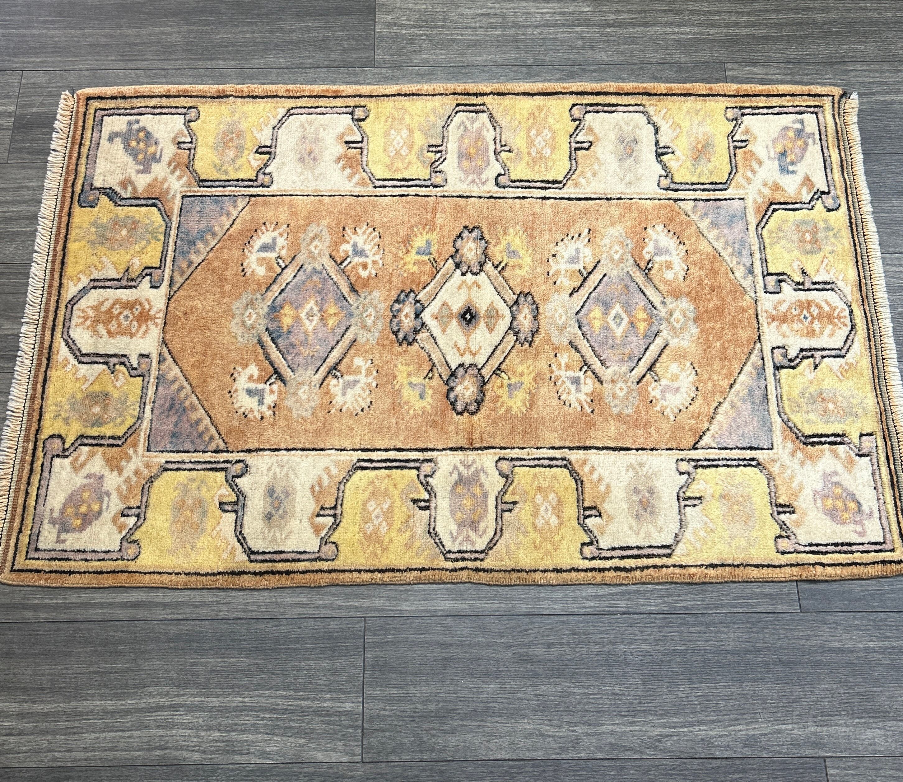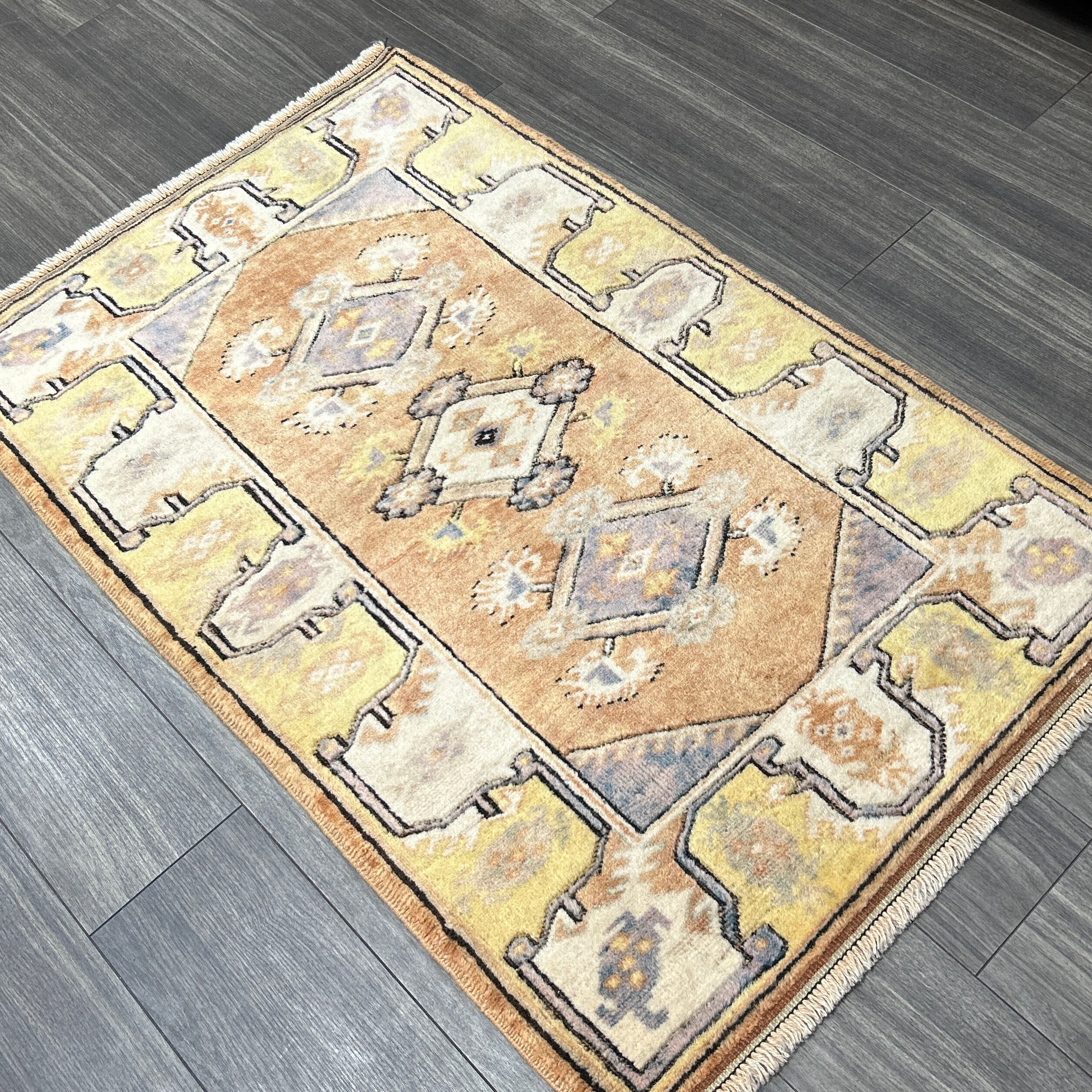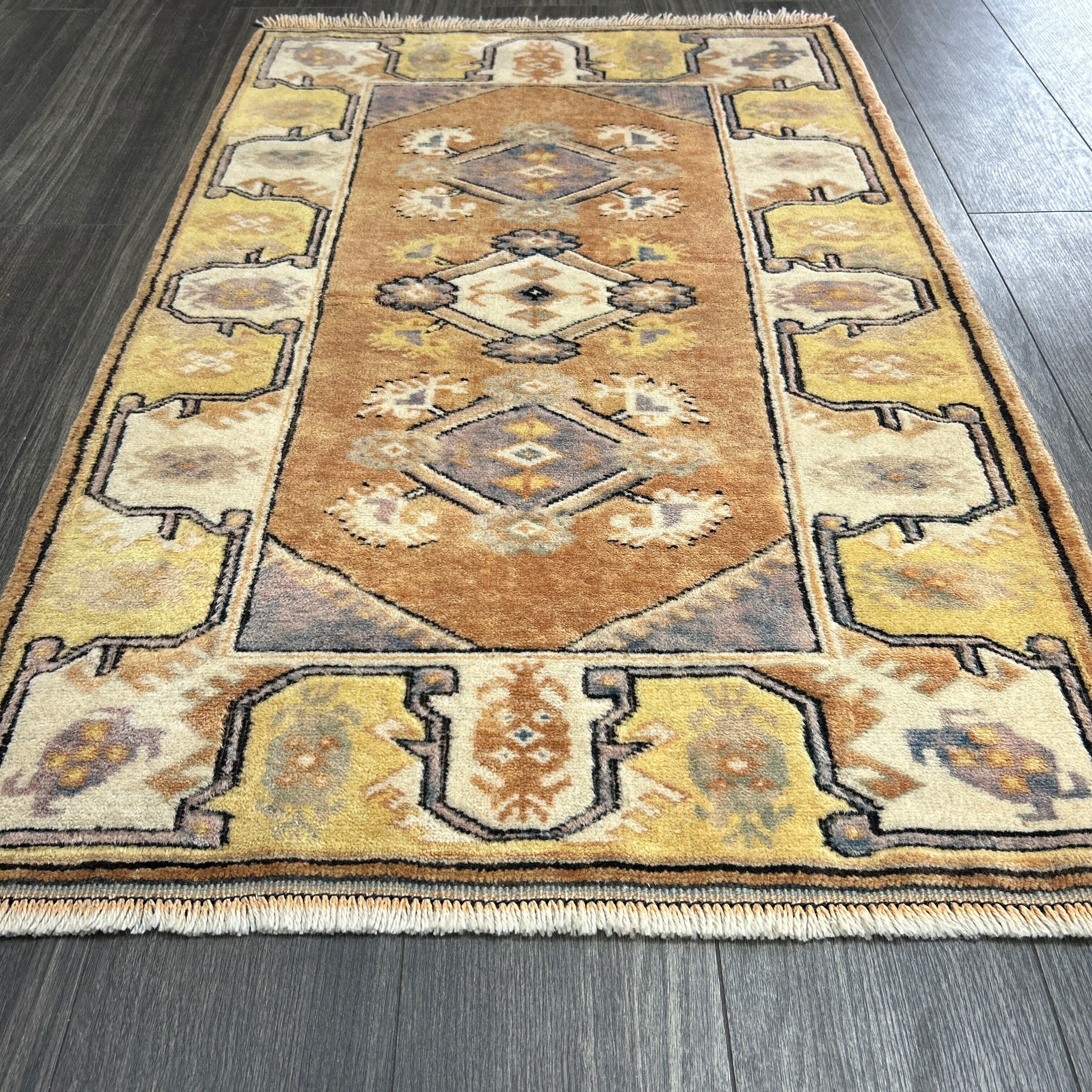 ウール製の幾何学模様ラグ、オレンジと青の色合いが特徴。