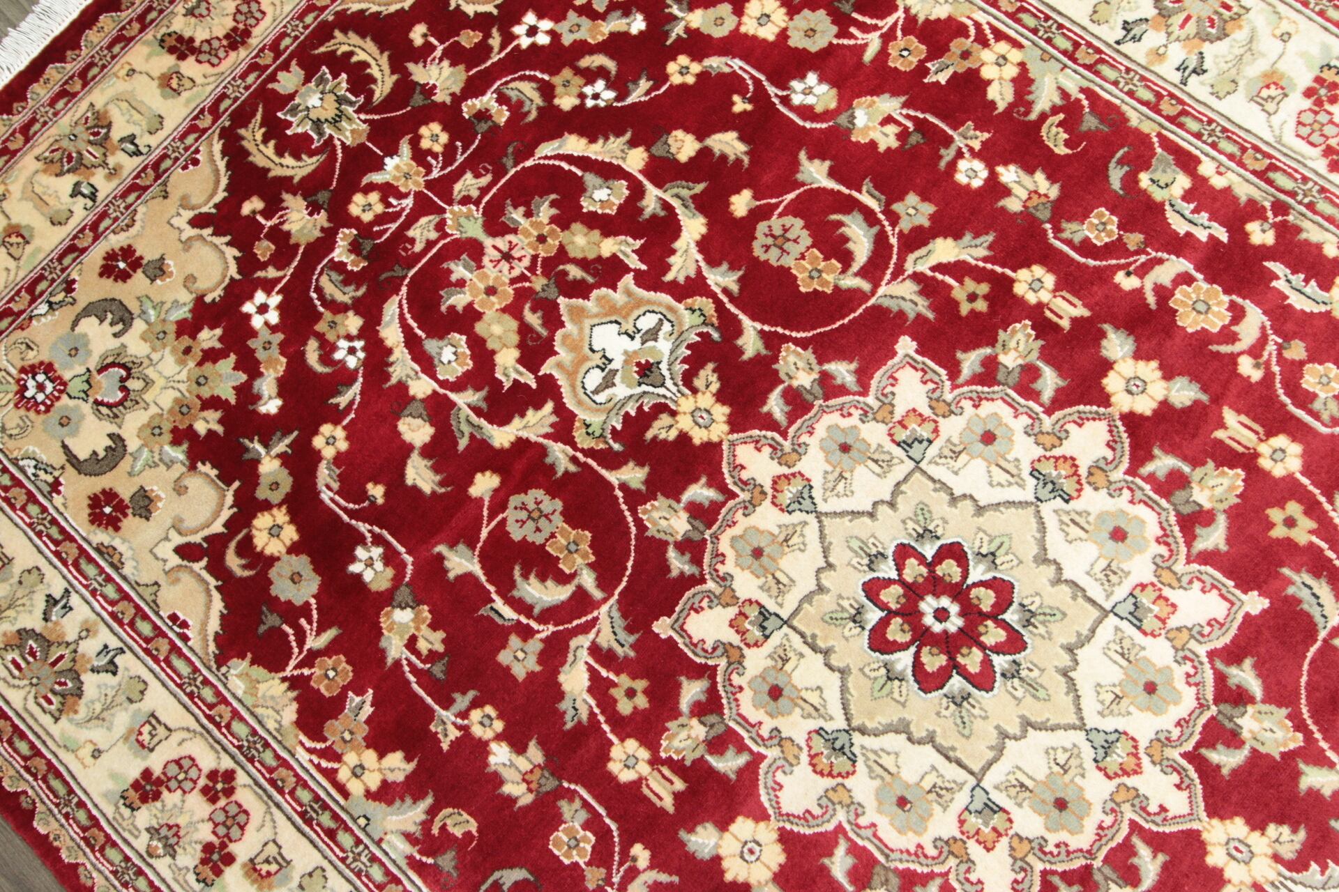光の当たり方により色の見え方が玉虫色のように変化するのが手織り絨毯の美しさの特徴の一つです。