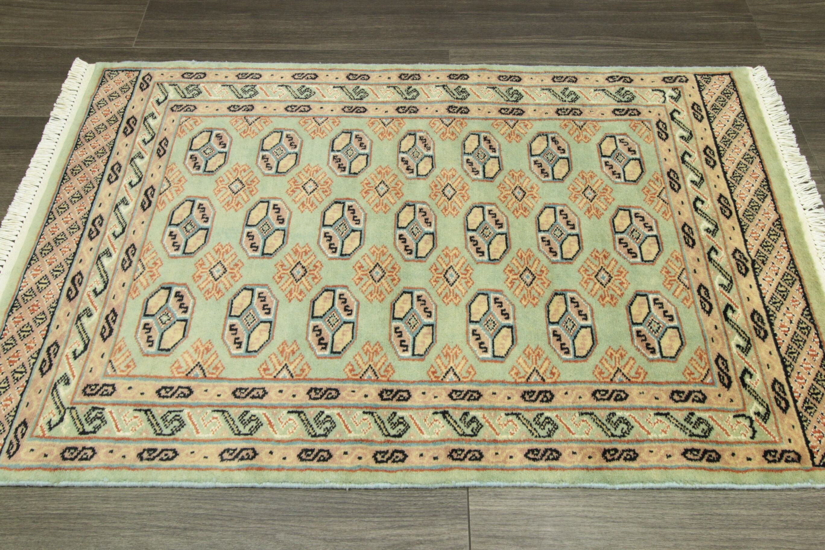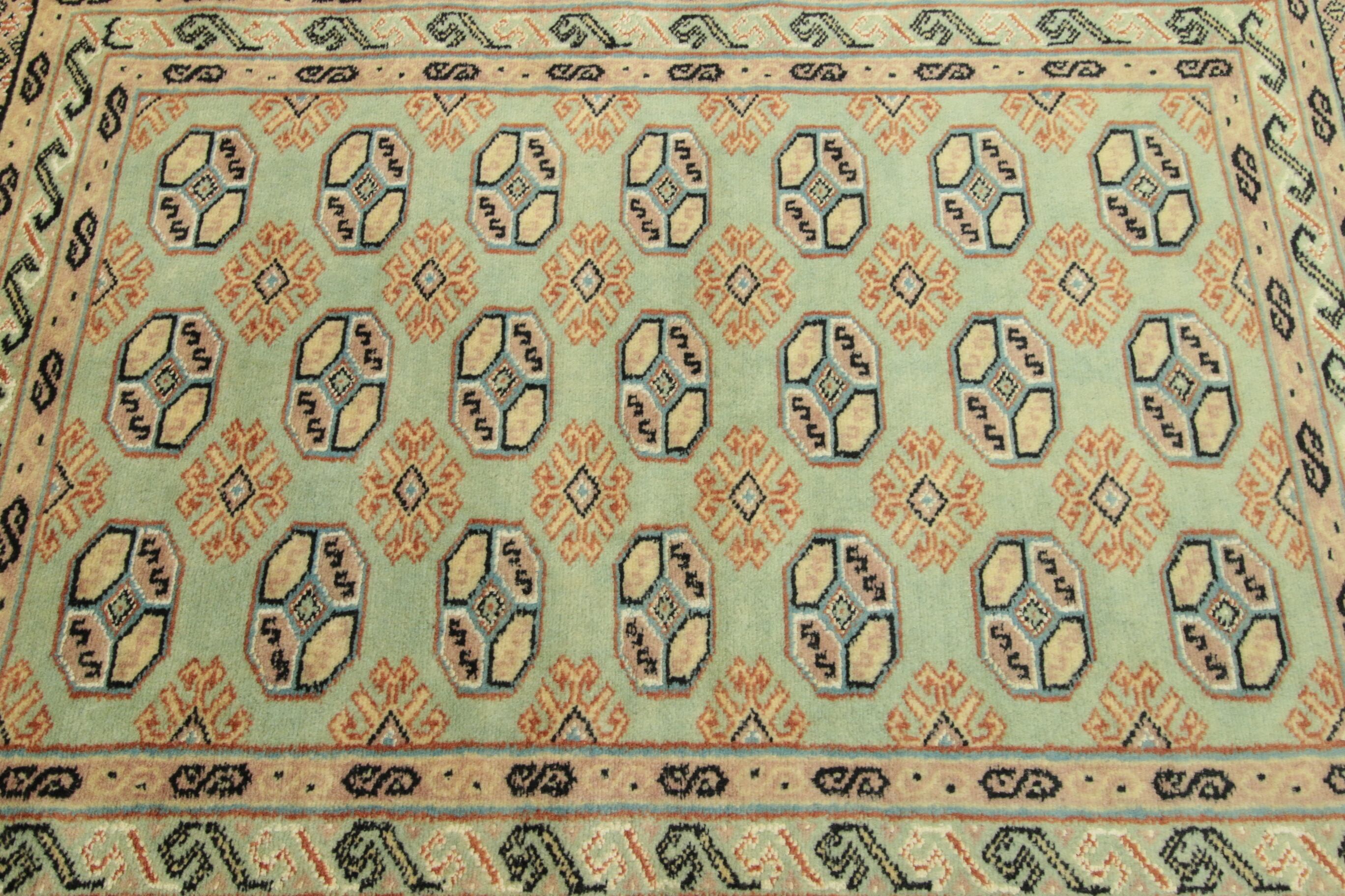 ライトグリーンのベースカラーに幾何学モチーフがちりばめられた素敵なデザインの絨毯です。